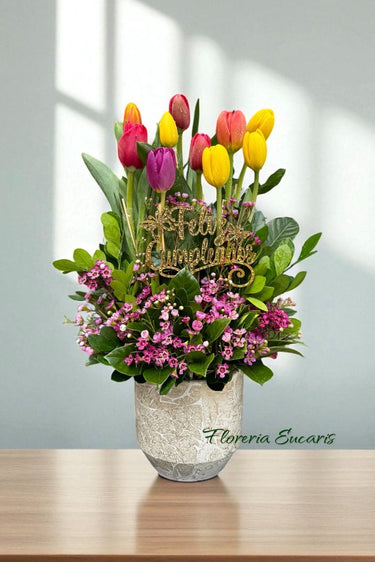 ▸ Hermosa base de cerámica blanca acompañada de 10 tulipanes importados de color variado y finos follajes de estación.