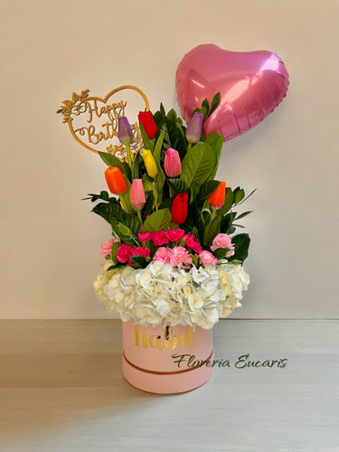 ▸ Hermoso box rosado con hortensias de vivero y 10 tulipanes importados