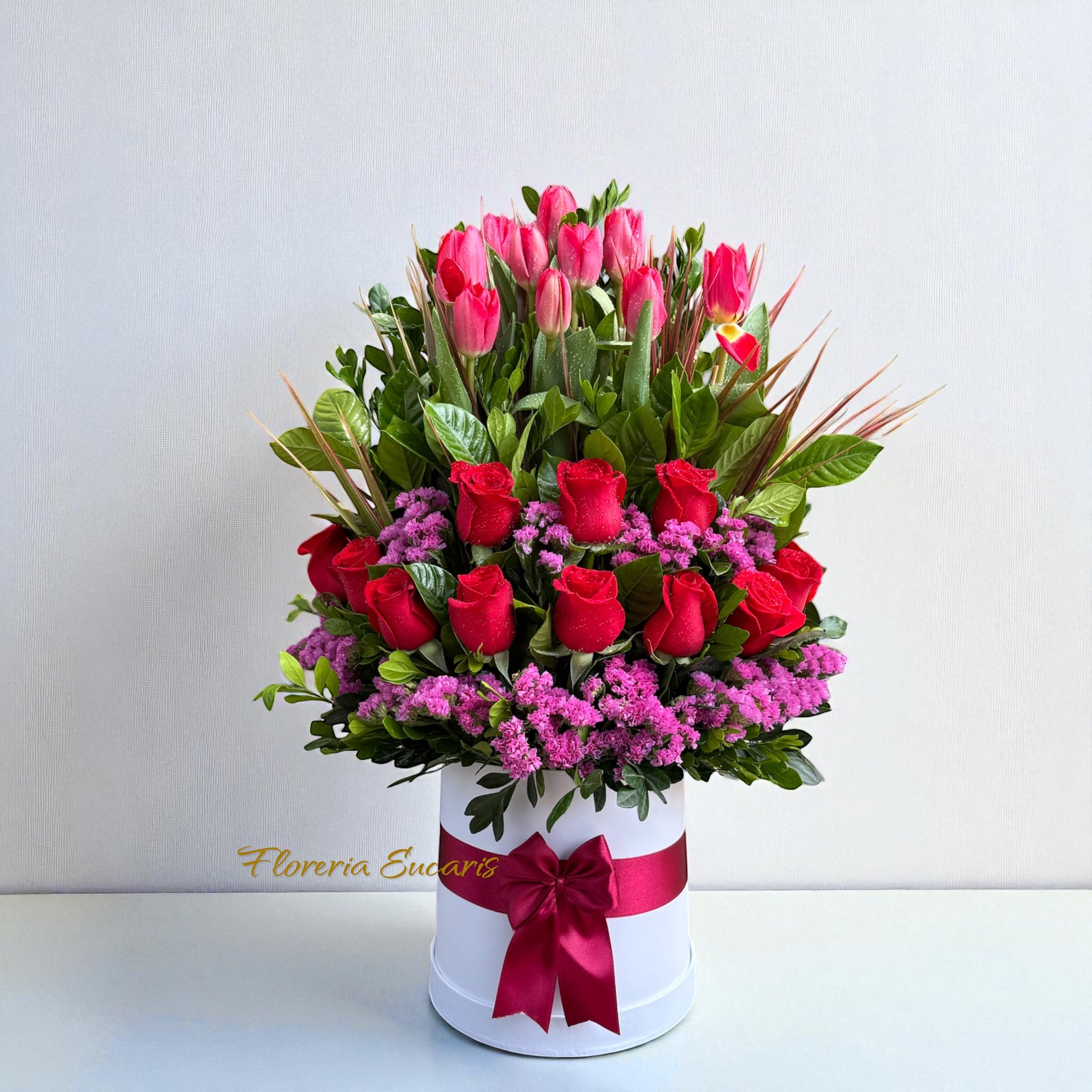 ▸ Precioso box de tulipanes premium, rosas rojas, flores de complemento y follajes de temporada.