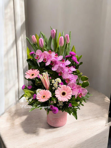 ARREGLO DE TULIPANES Y ORQUÍDEAS AMBAR