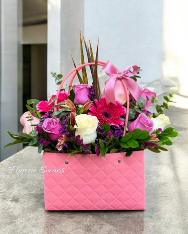 ▸ Hermoso arreglo floral en cartera decorativa con rosas, gerberas y follajes de temporada.
