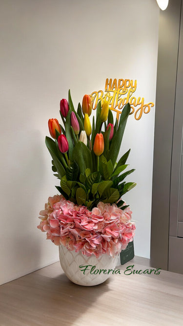 ▸ Hermosa base de cerámica con hortensias de vivero, 10 tulipanes importados y follajes de temporada