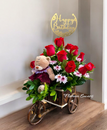 ▸ Exclusiva carreta artesanal con rosas premium y peluche antialergico