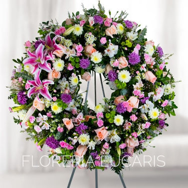 - Corona con rosas rosadas, liliums fucsias, pompones y follajes de estación.
