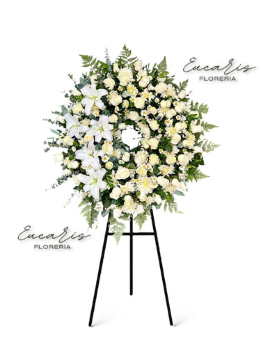 - Corona con rosas blancas, pompones blancos, liliums y follajes de estación.