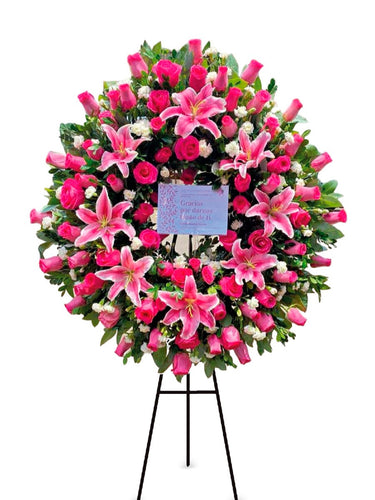 • Corona con rosas premium, liliums fucsias, claveles blancos y follajes de estación.