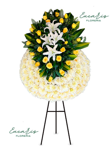 - Corona con rosas amarillas, liliums blancos, pompones blancos y follajes de estación.