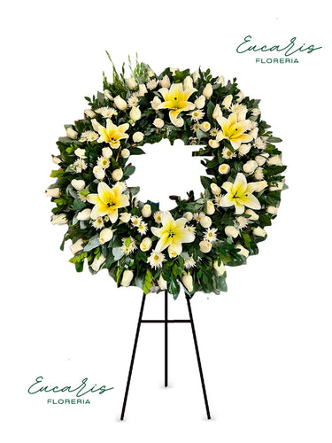 • Corona  picaron con rosas premium, liliums, pompones y follajes de estación.