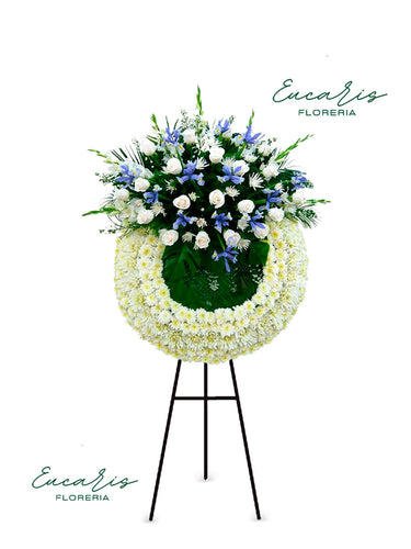 - Corona de rosas, pompones blancos, iris azules, gladiolos y follajes de estación.