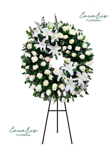 • Corona con rosas blancas premium, liliums blancos y follajes de estación.