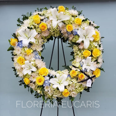 - Corona con rosas amarillas, liliums blancos, pompones y follajes de estación.