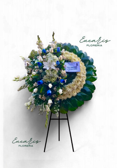 - Gladiolos, pompones, rosas blancas y azules de primera calidad.