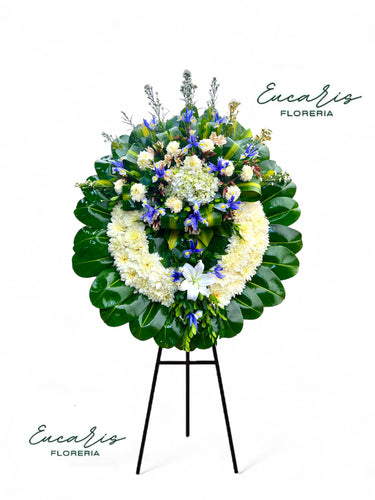 Una corona con blanco y acentos azules que evoca serenidad y dignidad para despedidas con sentido.