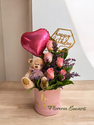 - Hermoso box rosado con osita importada, rosas premium rosadas, follajes y flores de complemento.