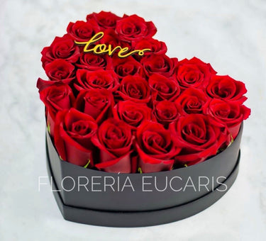 ▸ Hermoso box con forma de corazón con rosas rojas premium y topper de acuerdo a la ocasión