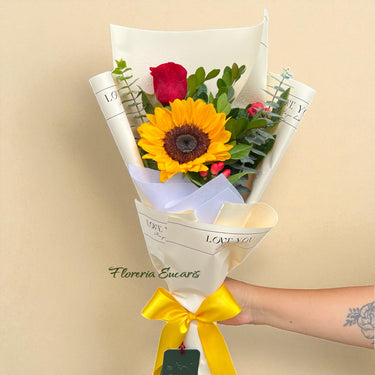 ▸ Hermoso ramo de girasol, rosas roja premiúm, flores de complemento y empaque papeles y estilo coreano.