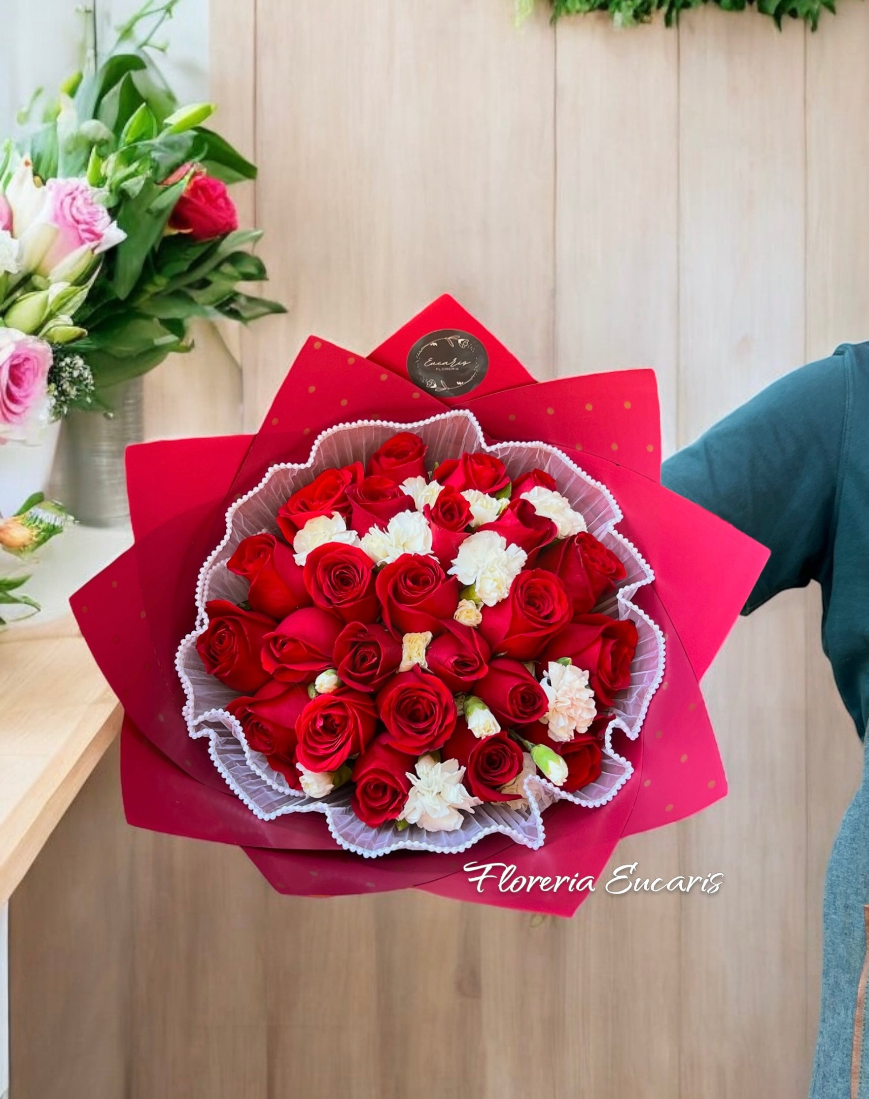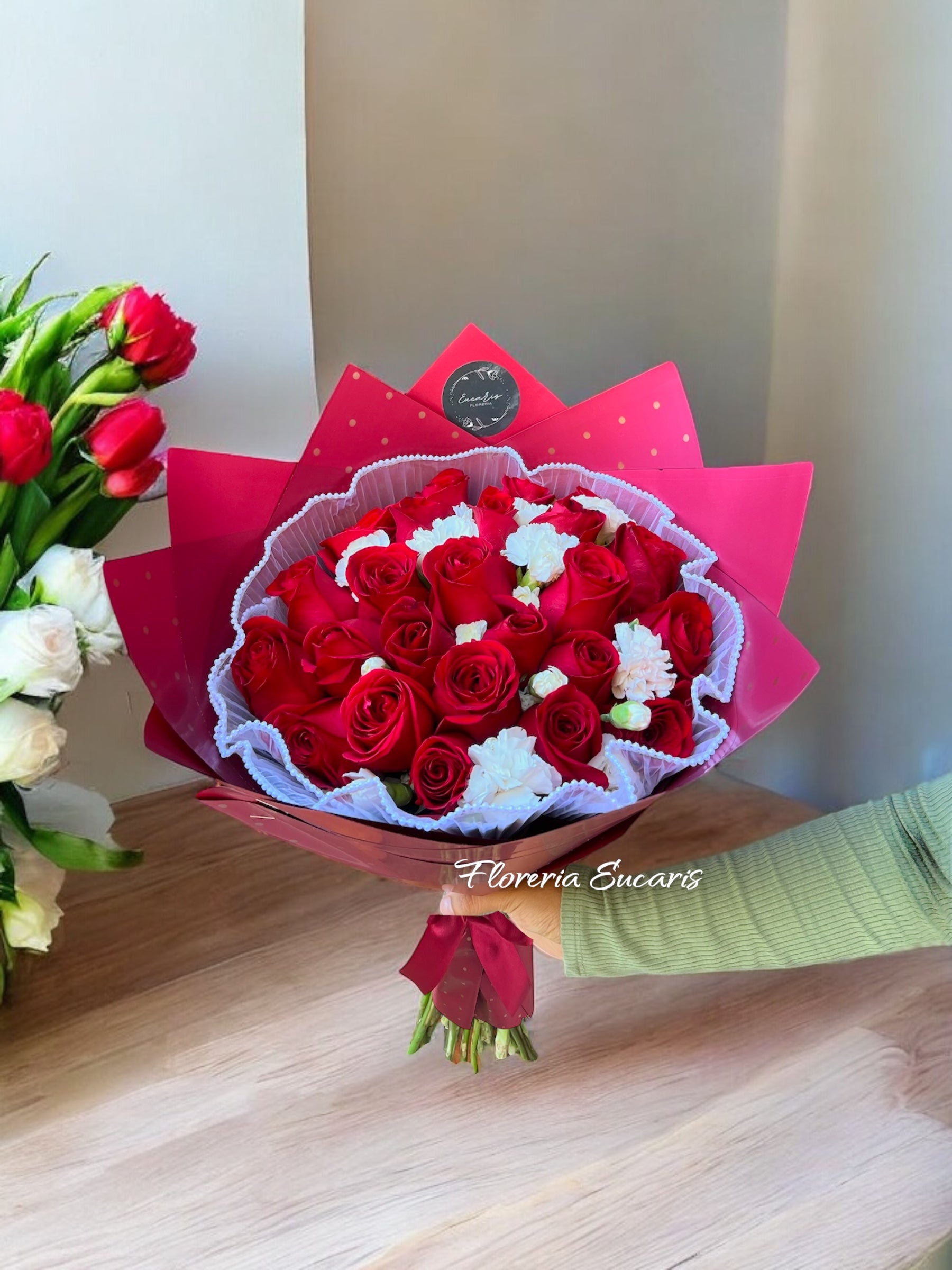 - Hermoso ramo de 24 rosas rojas premium con claveles blancos