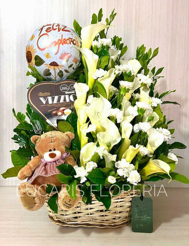 ▸ Hermosa canasta artesanal, acompañada de finos cartuchos de vivero color blanco, claveles de vivero y finos follajes de estación.