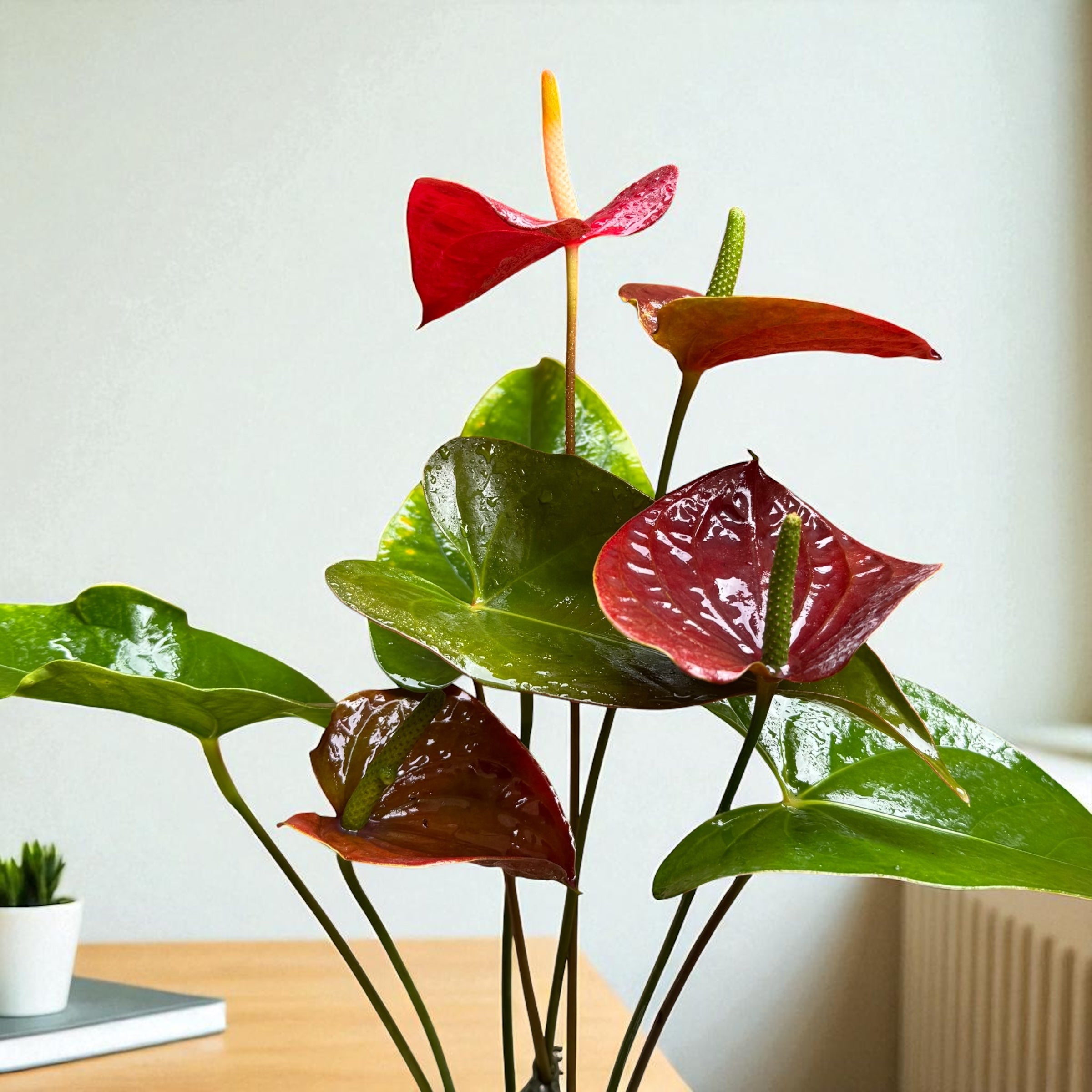 - Planta de Anturio en macetero decorativo, con hojas verdes elegantes y flores rojo vino según temporada.