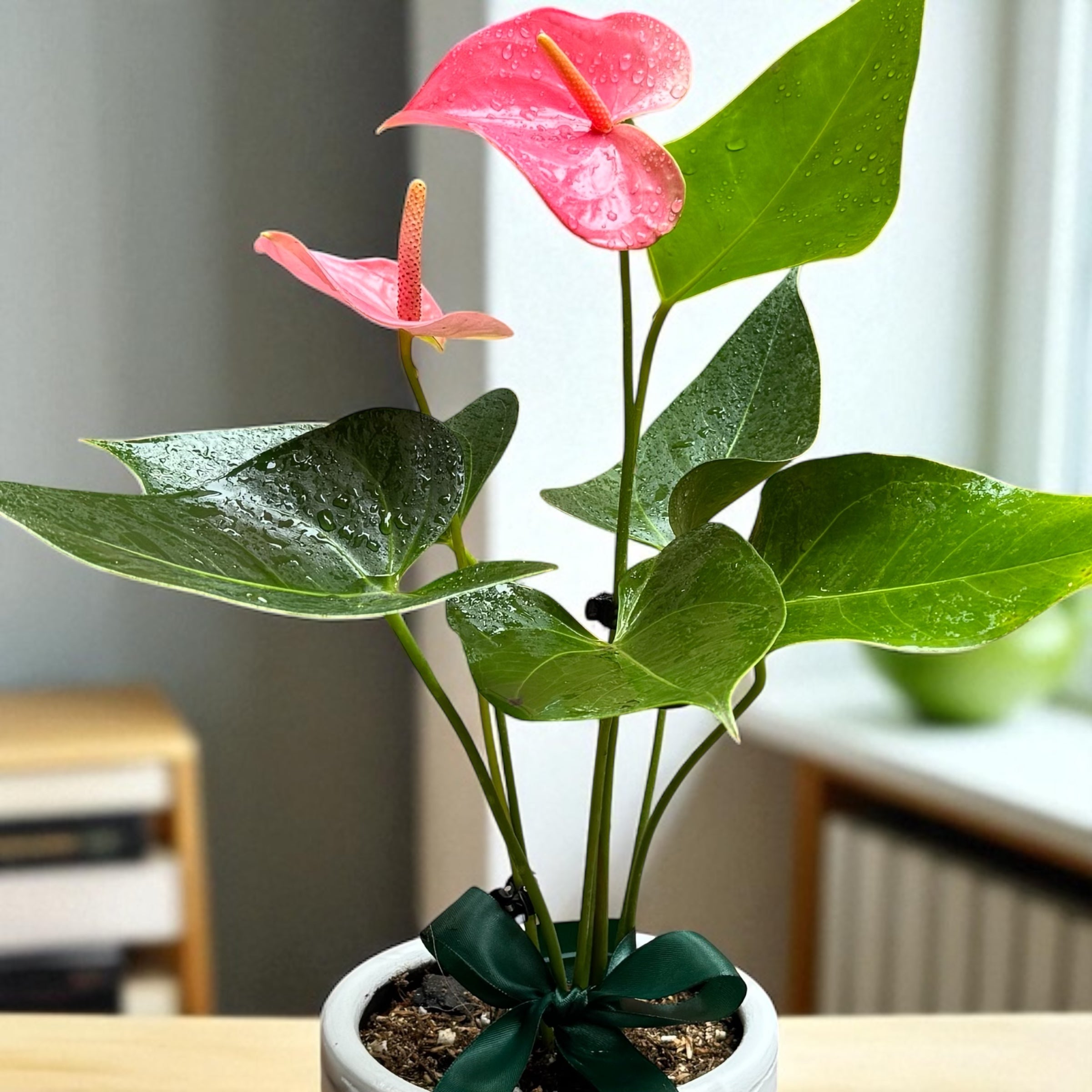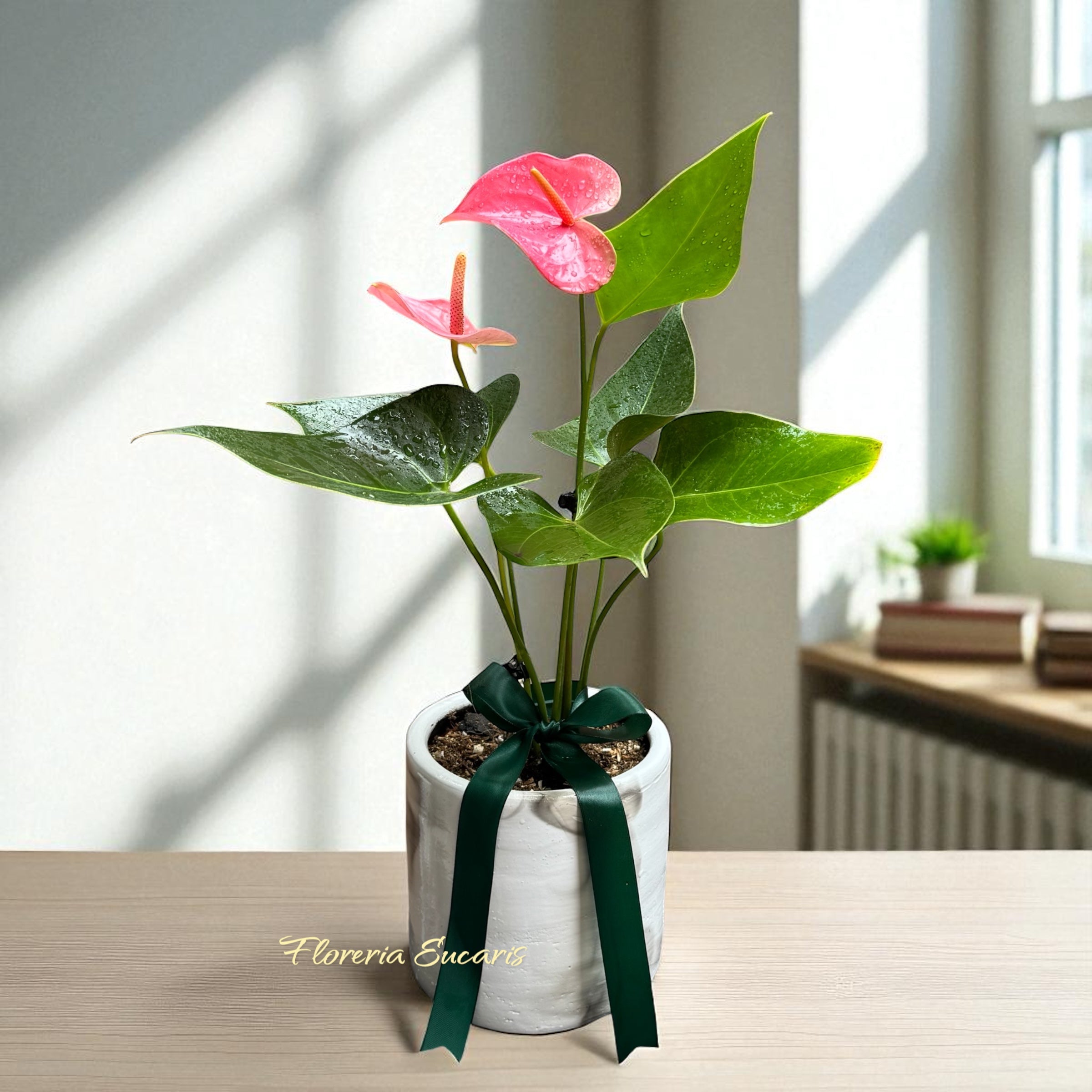 - Planta de Anturio en macetero decorativo, con follaje verde y flores Rosadas según temporada.