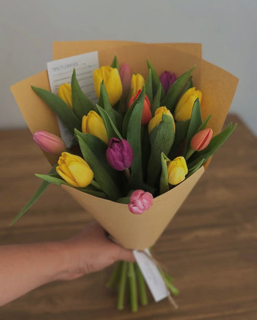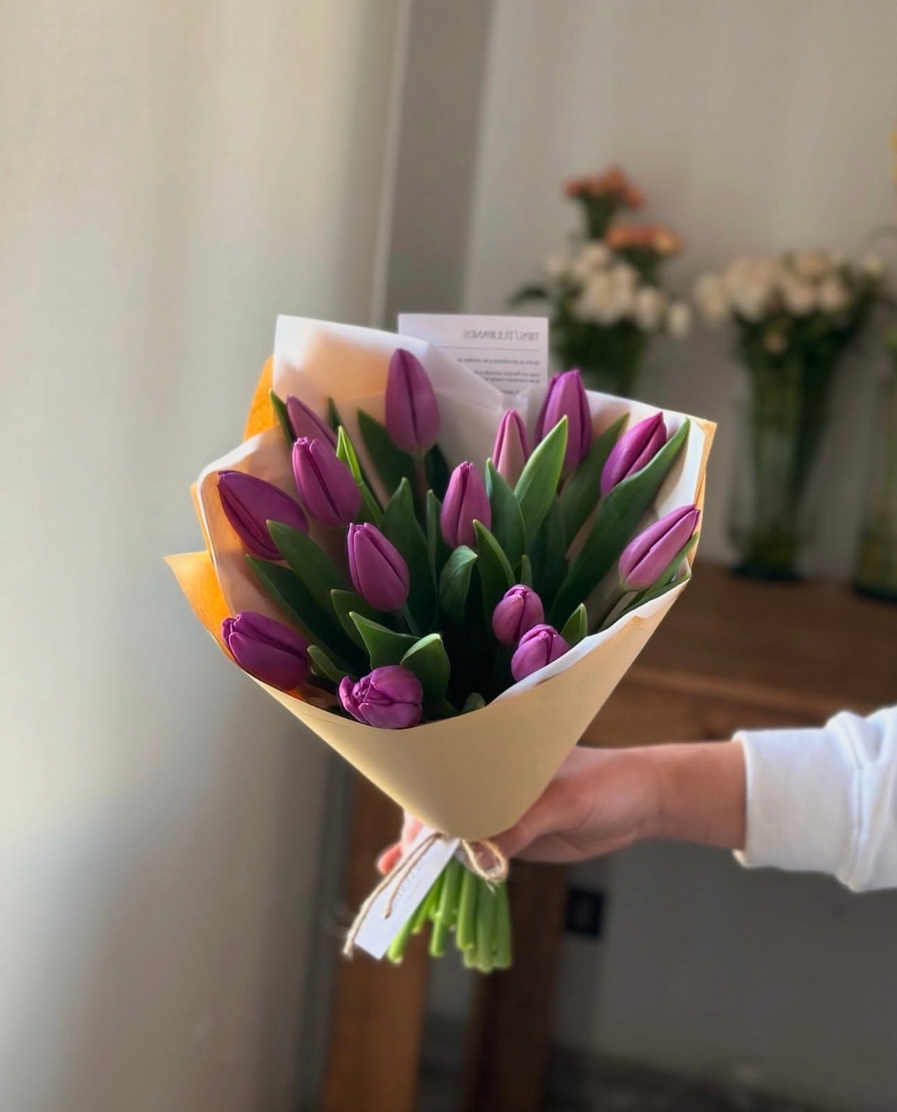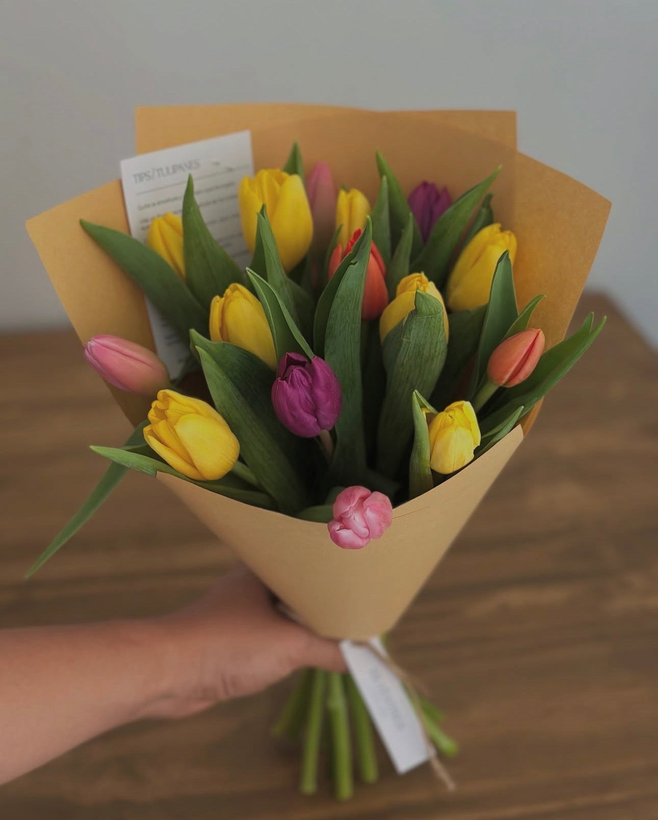 - Ramo elaborado con 15 tulipanes frescos de temporada, seleccionados cuidadosamente por su color y durabilidad.