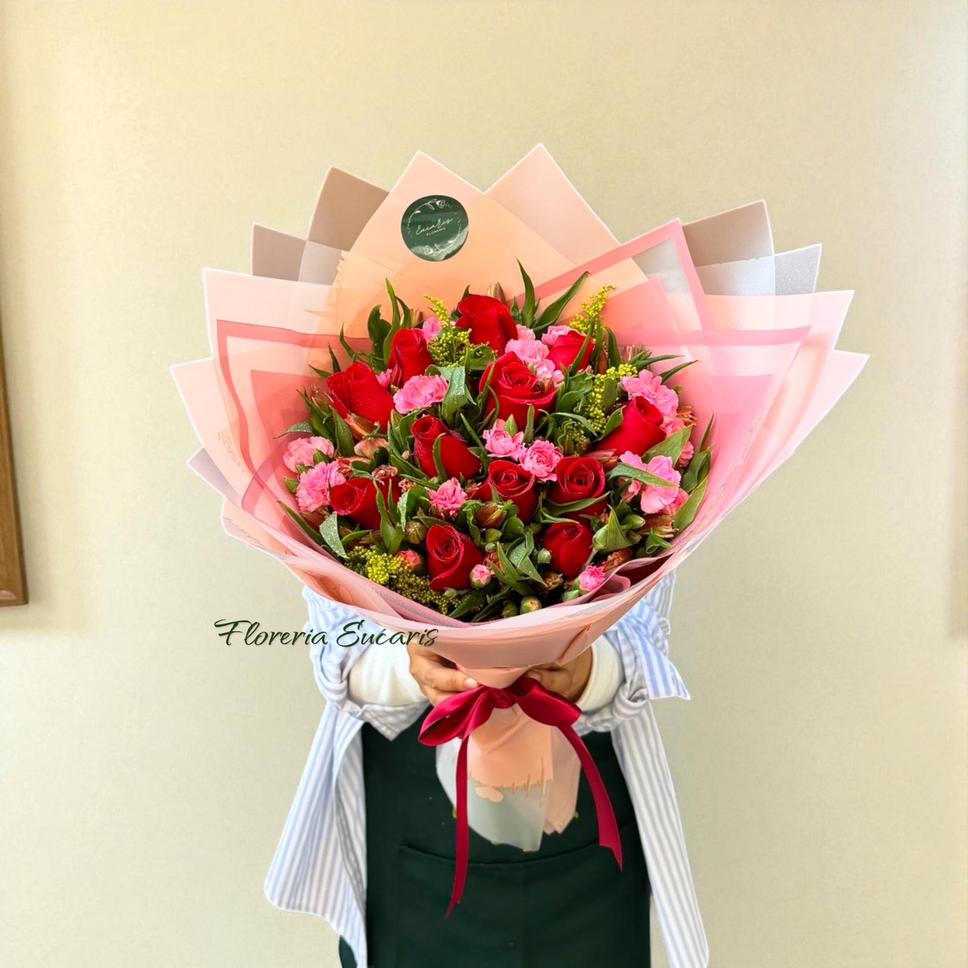 • 12 rosas rojas premium combinadas con claveles rosados y astromelias frescas.