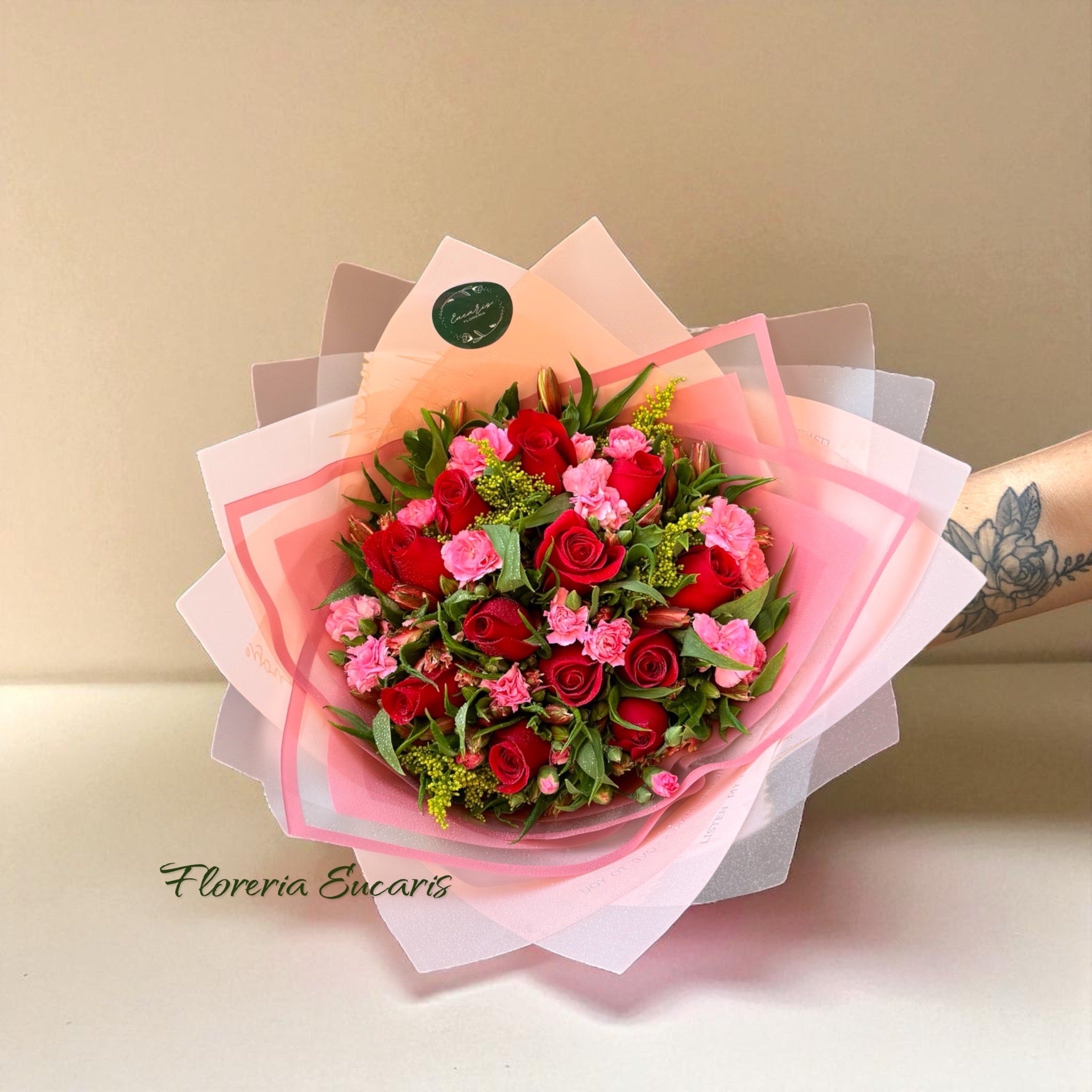 Un bouquet que combina rosas rojas, claveles rosados y astromelias para transmitir emociones sinceras y llenar de alegría cualquier ocasión especial.