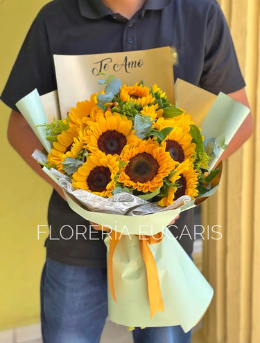 ▸ Hermoso ramo 8 de girasoles, stilver y follajes de estación.