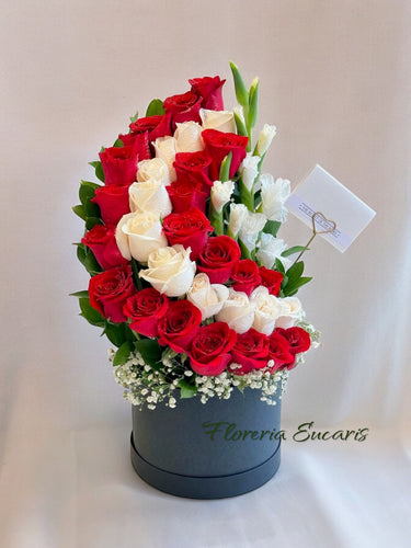 - Hermoso Box negro con rosas rojas y blancas premium, Gladiolos de vivero, yicsofilias blancas y follajes de temporada