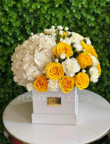 ▸ Box de rosas amarillas, claveles blancos, hortensias y follajes verdes