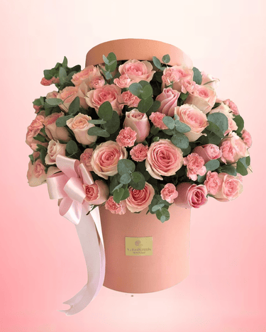 ▸ Box de 50 rosas rosadas premium, silver dolar, claveles y follajes de temporada.