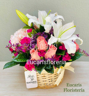 ▸ Hermosa canasta de mimbre con lirios blancos de importación, rosas premium, hortensias de vivero, variedad floral y finos follajes de temporada.