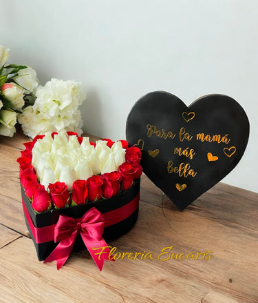 ▸ Hermoso box con forma de corazón con rosas rojas y blancas premium en el centro y tapa personalizable