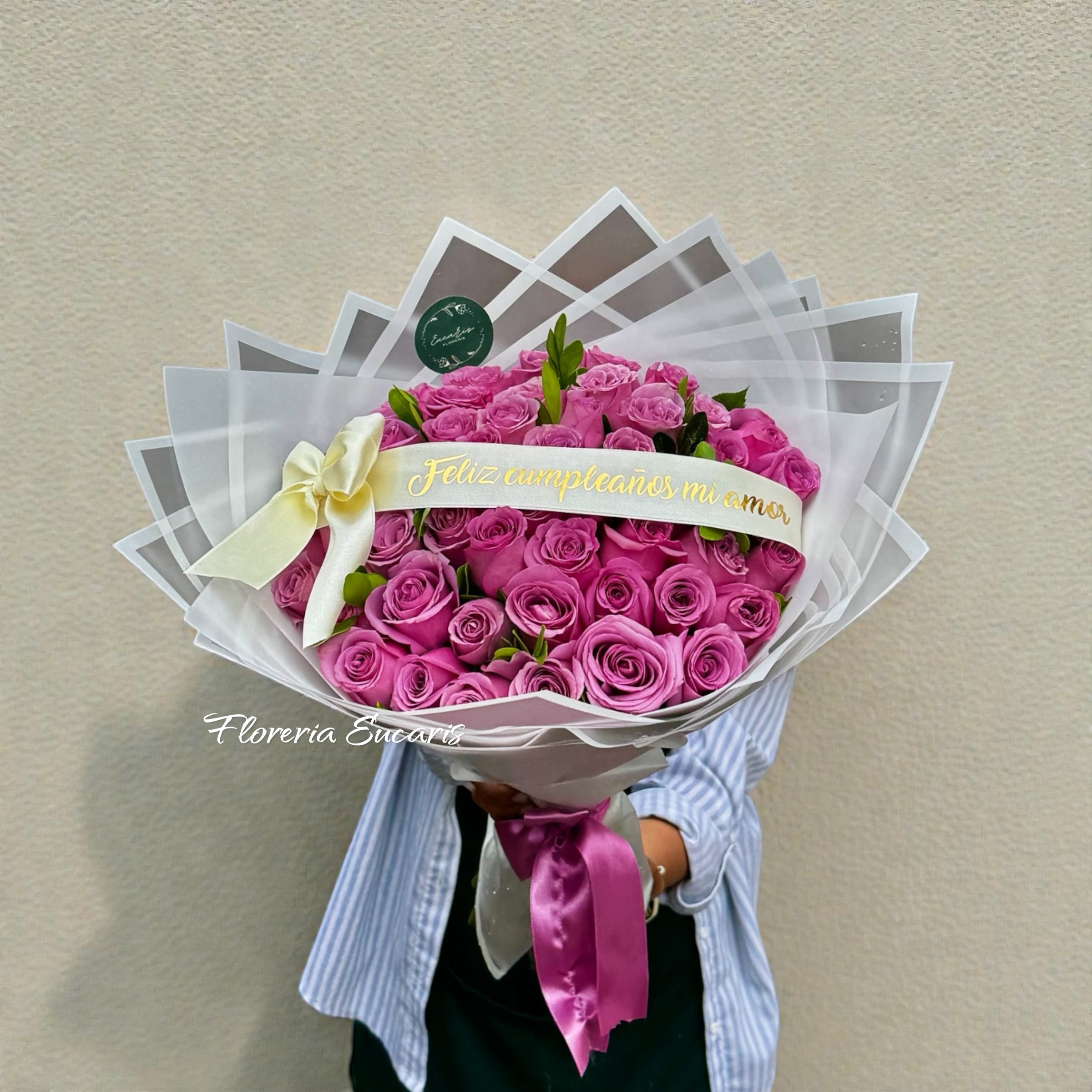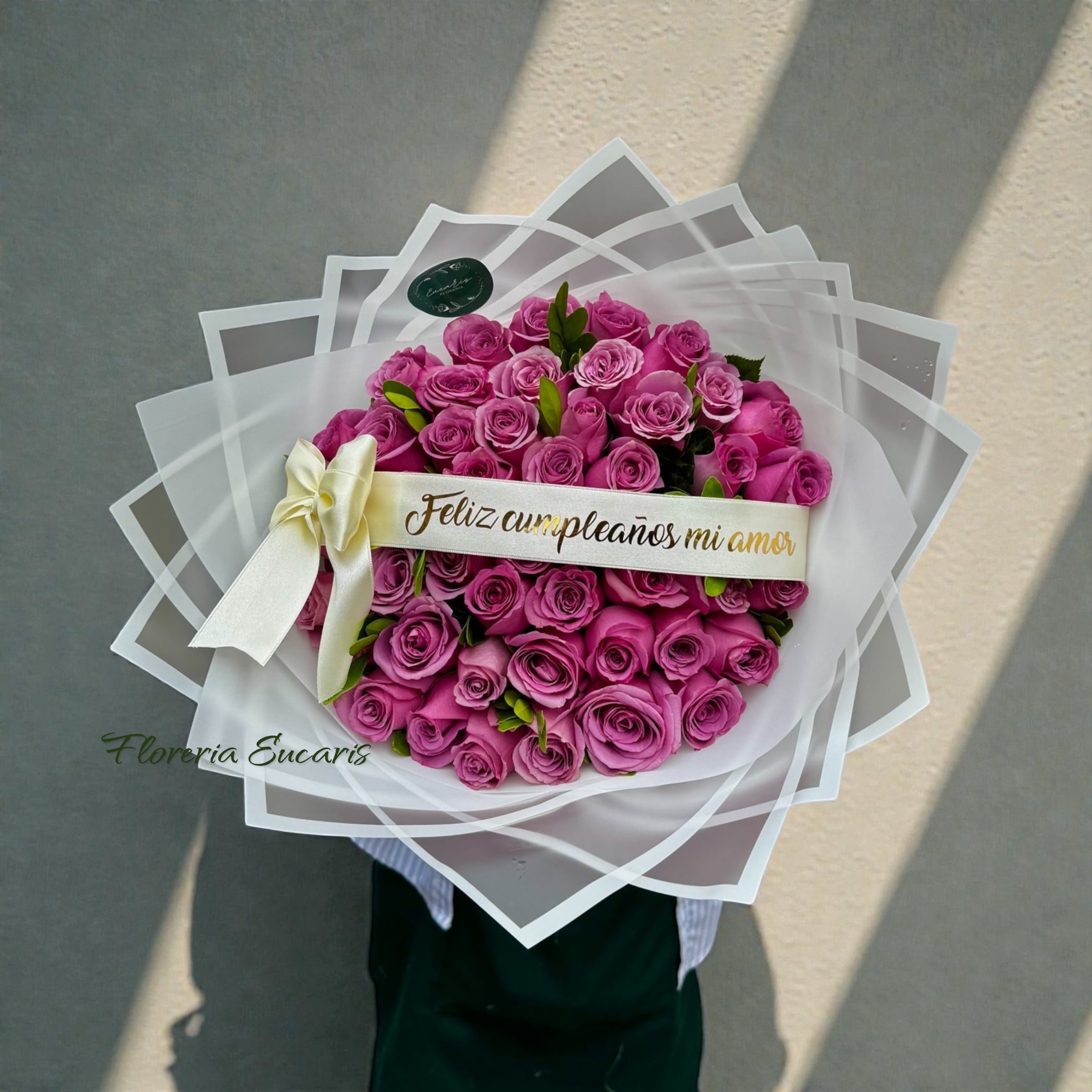 • Ramo floral compuesto por 50 rosas lilas frescas, cuidadosamente seleccionadas.